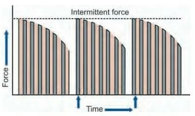 Lực ngắt quãng giảm về 0 giữa các lần kích hoạt. Có một khoảng thời gian chậm giữa các lần kích hoạt hệ thống lực. Lực ban đầu cao và giảm về 0 theo thời gian, điều này cho các tế bào mô có thời gian phục hồi trước khi hệ thống lực được kích hoạt trở lại. Những dẫn chứng của việc đặt lực ngắt quãng bao gồm headgear hoặc facemasks được mang trong một khoảng thời gian cụ thể mỗi ngày hoặc cơ chế dùng loop để kéo lùi trong chỉnh nha cố định.