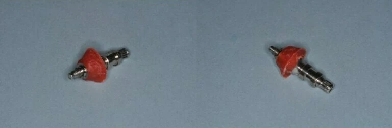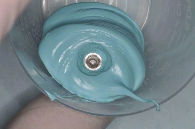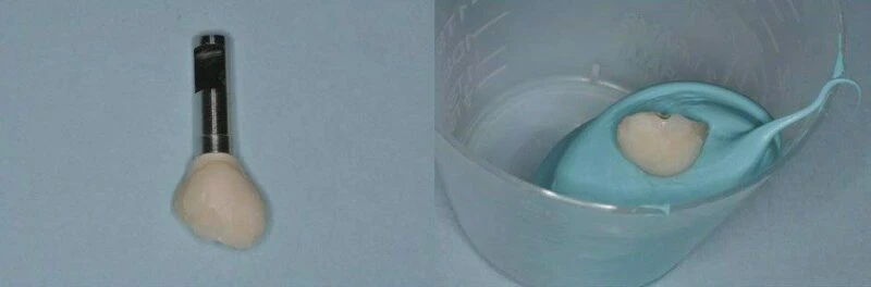 Sau đó gắn bản sao implant vào phục hình tạm. Bơm một ít chất lấy dấu PVS (cao su polyvinyl siloxane) ra ly nhựa nhỏ. Vùi bản sao implant và phục hình tạm vào trong cao su và chờ tới khi cao su đông cứng hoàn toàn.