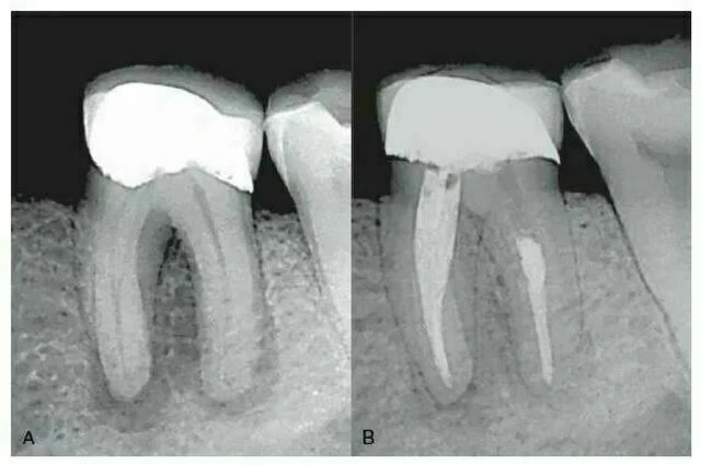Hình 7 – 8. A, Phim trước điều trị răng cối lớn thứ nhất hàm dưới cho thấy thấu quang vùng chẽ và quanh chân răng. B, Phim sau điều trị một năm cho thấy sự lành thương đáng kể (Courtesy Dr. Raed S. Kasem, Clearwater, FL.).