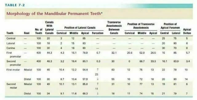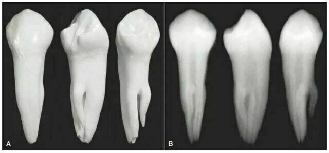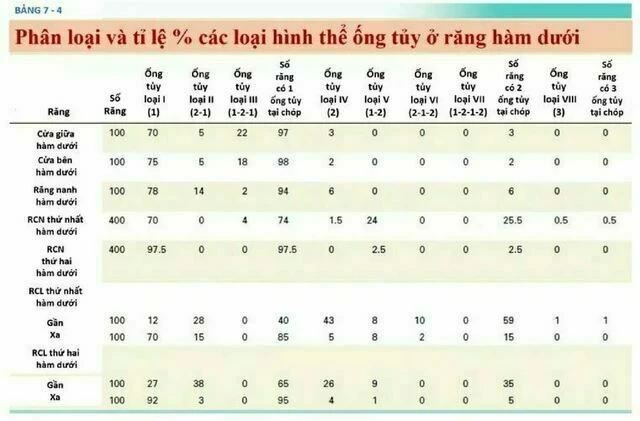 Các nghiên cứu khác thực hiện trên 1000 răng cũng có những kết quả về hình thái răng tương tự. Nghiên cứu khác sử dụng hơn 1000 răng và mô tả kết quả hình thái tương tự, tuy nhiên một điều ngoại lệ là một ống tủy được tìm thấy ở 23% răng cửa bên hàm trên, 55% ở chân ngoài gần răng cối lớn thứ hai hàm trên và 30% ở chân xa của răng cối lớn thứ hai hàm dưới. Sự khác biệt này hầu hết là do sự khác nhau của nhóm dân số trong hai nghiên cứu. Một nhóm khác nghiên cứu ở 100 răng trước hàm dưới và tìm thấy thêm hai loại ống tủy mới. Loại thứ nhất, hai ống tủy đi ra từ buồng tủy đến giữa chân răng, tại đây ống tủy trong phân làm hai; cả ba ống tủy này nối lại với nhau tại 1/3 chóp chân răng và đổ ra cùng chung một lỗ (hình 7-12, A). Loại thứ hai, một ống tủy đi ra từ buồng tủy, chia làm hai ở 1/3 giữa chân răng, sau đó nối lại với nhau để tạo nên một ống tủy, rồi lại chia ra thành các ống tủy khác nhau và đổ ra ba lỗ chóp riêng biệt (hình 7-12, B). Một nhóm các biến thể khác được Burmese quan sát thấy đầu tiên ở các răng cối lớn hàm dưới; nghiên cứu này cho thấy thêm bảy loại biến thể (hình 7-13).