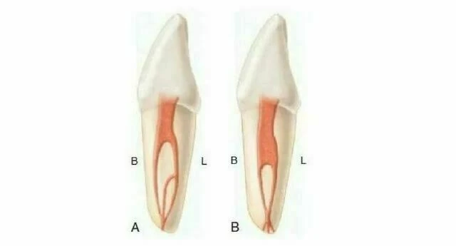 Hình 7 – 12. Biểu đồ mô tả hình thể ống tủy của Kartal và Yanikoglu. B, Mặt ngoài; L, Mặt trong.