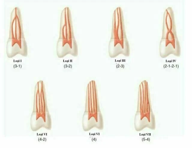 Các nhà lâm sàng cần phải làm quen với các đường đi khác nhau của ống tủy đến chóp răng. Hệ thống ống tủy rất phức tạp, và các ống tủy có thể phân nhánh, chia ra và nối lại. Hệ thống ống tủy được Weine chia làm bốn loại cơ bản. Các nhà nghiên cứu khác sử dụng các răng đã được làm sạch, trong đó hệ thống ống tủy được nhuộm bằng hematoxylin, họ nhận thấy rằng hệ thống ống tủy phức tạp hơn nhiều; người ta đã xác định được tám loại hình thể của ống tủy như sau (hình 7 – 11):