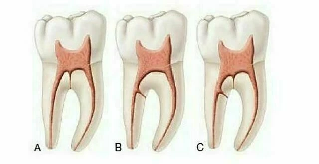 Hình 7 – 6. Các ống tủy phụ với ba hình ảnh khác nhau ở răng cối lớn thứ nhất hàm dưới. A, Trong 13% trường hợp, ống tủy vùng chẽ đi từ buồng tủy đến vùng giữa các chân. B, Trong 23% trường hợp, ống tủy đi từ 1/3 cổ của chân răng đến vùng chẽ (80% đi từ ống tủy xa). C, Khoảng 10% vừa có ống tủy bên lẫn ống tủy vùng chẽ.
