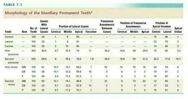 Từ nghiên cứu của Hess và Zurcher cho đến những nghiên cứu gần đây đã chỉ ra sự phức tạp về mặt giải phẫu của hệ thống ống tủy, nghiên cứu cho thấy một chân răng với một ống tủy thuôn và một lỗ chóp là một điều ngoại lệ so với thông thường. Các nhà nghiên cứu chỉ ra nhiều lỗ chóp, nhiều ống tủy, chóp răng deltas, sự thông nối giữa các ống tủy, các điểm thắt lại trong ống tủy, ống tủy hình chữ C, và các ống tủy vùng chẽ, ống tủy bên hiện diện ở hầu hết các răng. Do đó, trong điều trị nội nha, các bác sĩ lâm sàng cần phải xem giải phẫu hệ thống ống tủy phức tạp là bình thường. Các răng cối nhỏ (hình 7-9) là một ví dụ hay về giải phẫu hệ thống ống tủy phức tạp. Chân răng phụ không thấy rõ trên các phim X-quang trước điều trị (xem hình 7-9 B). Hình 7-10 cho thấy mặt cắt ngang ở một chân răng tương tự. Răng này có hệ thống ống tủy nhỏ, hình dải ruy băng thay vì có hai ống tủy riêng biệt. Cả hai răng này đều là thách thức cho các nhà lâm sàng trong việc tạo hình, làm sạch và trám bít ống tủy.
