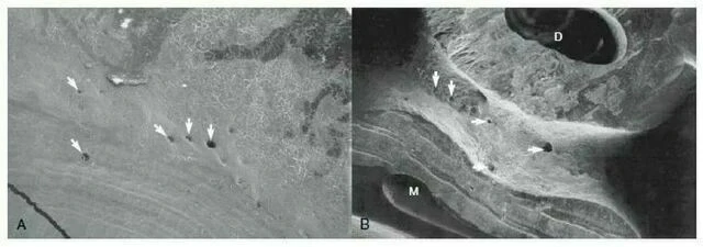 Hình 7 – 7. A, Hình chụp dưới kính hiển vi điện tử của sàn tủy răng cối lớn thứ nhất hàm dưới. Có thể thấy được nhiều lỗ đổ của ống tủy phụ (mũi tên), kích thước từ 20 đến 140µm (×20). B, Hình chụp dưới kính hiển vi điện tử của bề mặt vùng chẽ của răng cối lớn thứ nhất hàm dưới. Nhiều lỗ đổ của ống tủy phụ được thấy ở bề mặt vùng chẽ (×30). D, Ống xa; M, ống gần.