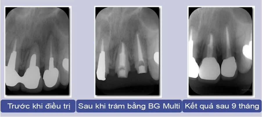 Hình chụp Xquang BG Multi điều trị hiệu quả các tổn thương quanh chóp giảm dần sau 9 tháng. (Nguồn: Nội dung được trích từ báo cáo khoa học: Translation Research for Future, Advanced, and Present Endodontic Therapies bởi Giáo sư – Bác sĩ Chiaki Kitamura – Chủ tịch Hội đồng Nội nha và Nha khoa phục hồi – Trường Nha khoa Đại học Kyushu. Báo cáo được thực hiện tại Đại hội Nội nha Thế giới IFEA 2018 – diễn ra tại Hàn Quốc 05/10/2018)