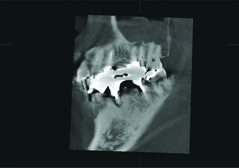 The sagittal view clearly confirms perforation of the Schneiderian membrane, and the coronal view revealed an odontogenic maxillary sinusitis and pachymenia. The injury of the sinus membrane may have been overlooked in this case if the diagnosis had been formulated on the basis of an X-ray that did not show the problem so clearly.