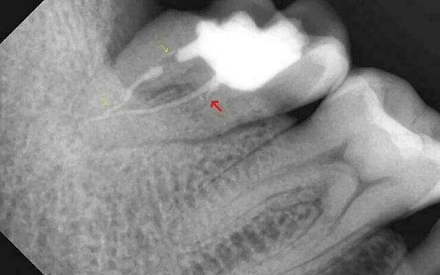 2. Thực hiện chụp phim cận chóp trước điều trị. Trên phim thấy hình ảnh trám bít ống tủy chưa kín khít (mũi tên vàng) và thiếu ống tủy phía gần (mũi tên đỏ).