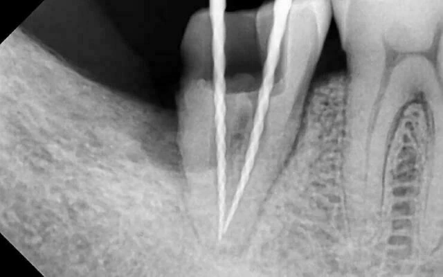 – NaOCl 5% ấm mỗi ống 2-3 phút 5ml, kết hợp siêu âm nội nha (Mani _size#25) trong 120s