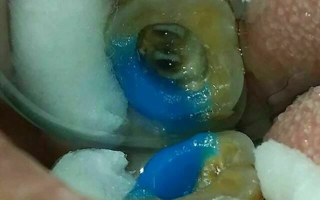 3. Gỡ mối hàn cũ và làm sạch ngà mủn. Sử dụng gel che lợi (Denu Dam) cô lập bảo vệ lợi xung quanh và tái tạo thành phía xa (xem thêm hình 5). LUÔN đặt ống hút phẫu thuật ở miệng ống tủy khi bơm rửa. Dung dịch bơm rửa chính NaOCl 5% 50 độ C kết hợp NaCl 0,9% sau mỗi lần đi dụng cụ vào ống tủy. Sử dụng kim bơm rửa nội nha (30G_Ck endo)