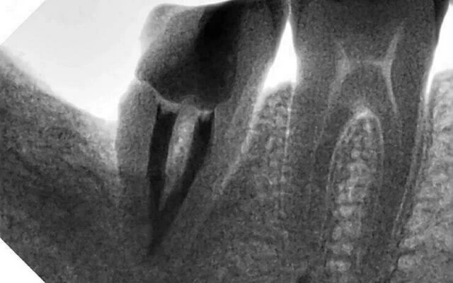 6. Hàn tủy bằng côn gutta percha F3 và cortisomol bằng phương pháp lèn ngang nguội. Kiểm tra lại độ khít sát bằng phim âm bản.