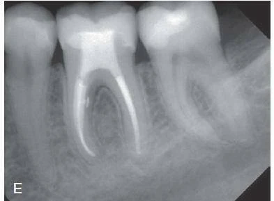 Hình 9.2. Điều trị tuỷ trong trường hợp bệnh lý chẽ răng và chóp răng. A – Hình ảnh phimchụp trước điều trị của răng #19 cho thấy tổn thương chẽ. B,C – Hình ảnh phim chụp sau sửa soạn và trám bít ống tuỷ. Chú ý ống tuỷ phụ trên 1/3 cổ của ống tuỷ. D,E – Hình ảnh phim chụp tái khám sau 2 tháng cho thấy sự liền vết thương nhanh (Courtesy Dr. H. Walsch.)