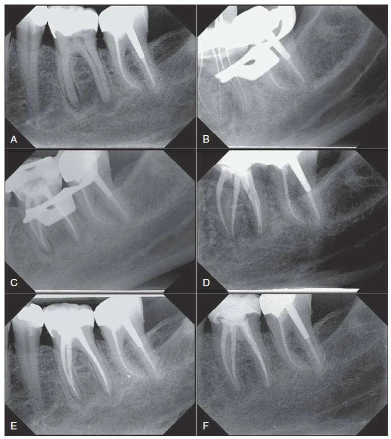 Hình 9.1 Tác động của điều trị tuỷ trên răng hàm – hàm dưới. A – Hình ảnh phim chụp trước khi điều trị của răng #19 cho thấy tổn thương thấu quang ở phía xa và phía gần của phần chóp răng. B – Hình ảnh phim chụp kiểm soát chiều dài làm việc cho thấy hai ống tuỷ phân biệt ở chân gần và hai ống tuỷ gần như nhập vào nhau ở chân xa. C – Hình ảnh phim chụp sau tạo hình hệ thống ống tuỷ với file nickel- titanium và trám bít bằng gutta-percha hơ nóng. D – Hình ảnh phim chụp tái khám sau 6 tháng răng #19 với phục hồilà chụp sứ; tái tạo xương gần chóp có thể quan sát thấy. E – Hình ảnh phim chụp tái khám sau 1 năm cho thấy sự liền thương tiếp tục ở vùng cận chóp. F – Hình ảnh phim chụp tái khám sau 5 năm, răng không chỉ hồi phục ở vùng cận chóp mà còn đáp ứng đủ chức năng và không có triệu chứng trên lâm sàng.