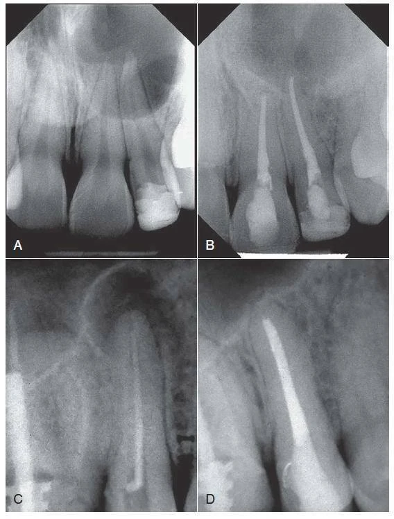Hình 9-4. Điều trị tuỷ trong trường hợp phá huỷ đáng kể cận chóp. A – Hình ảnh phim chụp trước điều trị của răng#8 và #9 cho thấy tổn thương lan rộng, răng không đáp ứng với thử lạnh. B – Hình ảnh phim chụp tái khám sau 2 năm cho thấy có tái tạo xương. Các ống tuỷ được tạo hình với dụng cụ cầm tay và các file máy và trám bít lèn bên bằng gutta-percha với chất AH Plus. C – Hình ảnh phim chụp trước điều trị của răng #4, cho thấy ống tuỷ trám bít, tổn thương cận chóp rộng và quan sát thấy trám bít chưa hoàn thiện. D – Hình ảnh phim chụp tái khám sau 2 năm cho thấy sự liền thương xương mà không điều trị phẫu thuật(A-B Courtsy Dr.M.Zehnder; C-D Courtesy Dr.E.Paque)