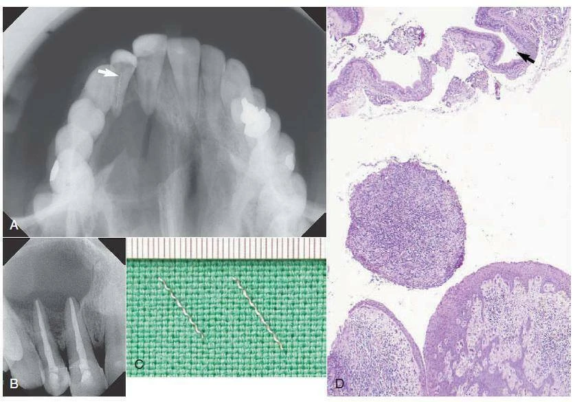 Hình 9.5 Khả năng và hạn chế của điều trị nội nha hướng thuận. Trong ca này, tổn thương rộng hàm trên bên phải được nạo bỏ và chẩn đoán mô học là nang chân răng. A – Hình ảnh phim cánh cắn trước điều trị cho thấy tổn thương rộng cận chóp ở hàm trên bên phải, cũng như hai dụng cụ phân biệt trên răng #7(Mũi tên). B – Hình ảnh phim chụp cận chóp sau điều trị của răng #7 và răng tuỷ hoại tử#8, được trám bít sau khi sử dụng thuốc canxi hyđroxit 2 tuần. Trám bít bằng lèn ngang với gutta percha và sealer 801 của Roth. C – Hai mảnh lentulo được lấy bỏ khỏi răng #7 (thước đo 0.5mm). D – Lát cắt mô học cho thấy biểu mô hô hấp và biểu mô vảy cũng như tế bào viêm, khẳng định chẩn đoán (C Courtesy Dr. I. Hegyi)