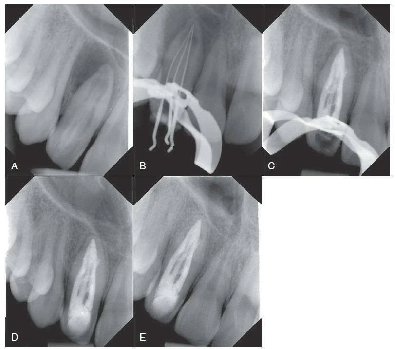 Hình 9.3 Điều trị tuỷ răng trong một ca có giải phẫu phức tạp và không thường gặp. A – Hình ảnh phim chụp trước điều trị của răng #7 bệnh nhân nam 12 tuổi cho thấy tổn thương cận chóp và phần giải phẫu chóp răng biến đổi (ví dụ,răng trong răng loại II, theo phân loại Oehlers). B – Hình ảnh phim chụp chiều dài làm việc cho thấy ba ống tuỷ phân biệt. C – Hình ảnh phim chụp sau điều trị 2+1/2 tháng sau khi tạo hình hệ thống ống tuỷ với hệ thống file nickel-titanium và máy siêu âm, băng ống tuỷ bằng calci hydroxit 4 lần cách nhau 2 tuần. Ta thấy có sự bù đắp xương cận chóp. D – Hình ảnh phim chụp tái khám sau một năm cho thấy liền thương cận chóp. E – Hình ảnh phim chụp tái khám sau hai năm cho thấy mô cận chóp đã dày đặc.