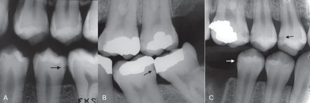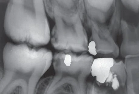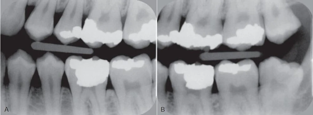 Phim bitewing (Hình 1) cho thấy không có tổn thương sâu răng tiến triển và đường viền xương mặt bên bình thường. Chỉ có một mối hàn amalgam nhỏ ở mặt nhai răng 46.