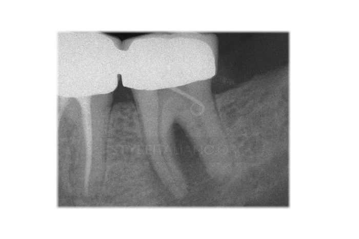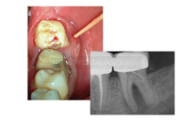 Răng hàm lớn thứ hai hàm dưới trong trường hợp này là ví dụ điển hình của vấn đề chúng ta đang quan tâm: trên lâm sàng (có lỗ dò) và X-Quang cho thấy tủy đã hoại tử và tổn thương xuất phát từ nội nha.