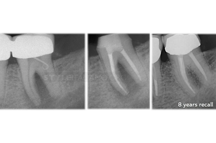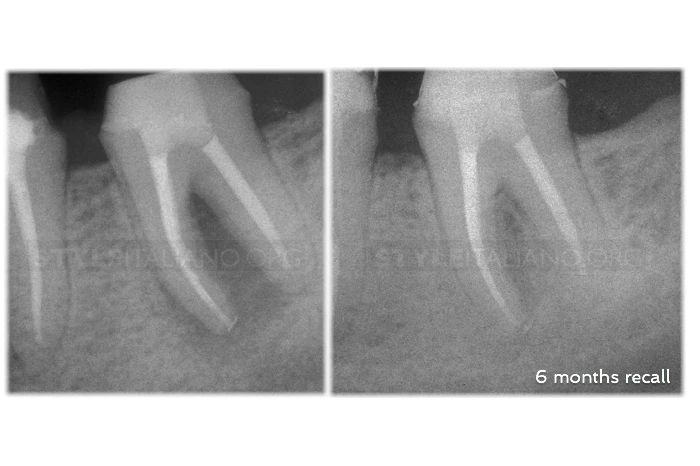 Tuy nhiên nếu nghĩ vậy thì đó sẽ là sai lầm lớn, bởi tổn thương này hoàn toàn ở nội nha, chúng ta có thể thấy kết quả lành thương sau điều trị 6 tháng.