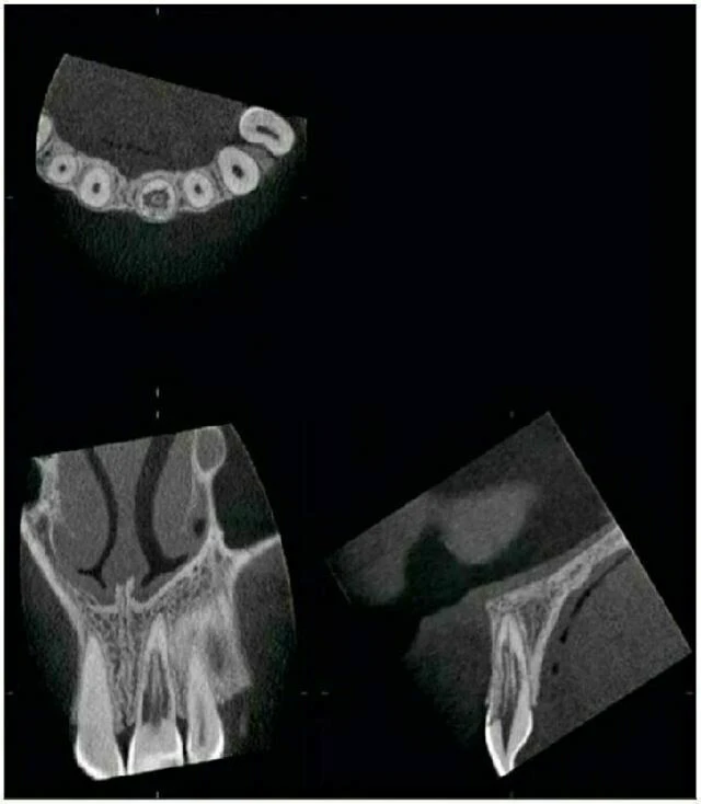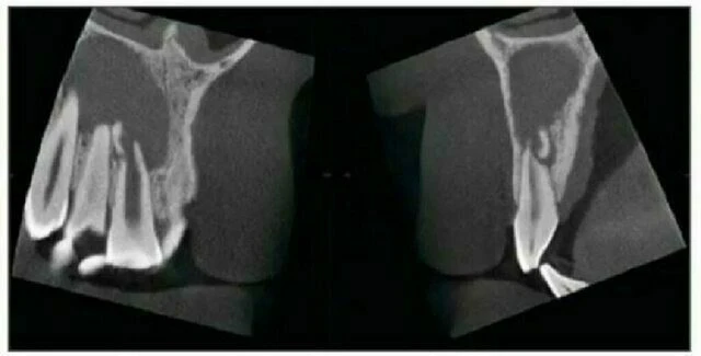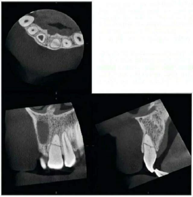 Chụp kiểm tra bằng Accuitomo vùng răng hàm trên phía trước cho thấy răng cửa giữa hàm trên bên phải có một ống tuỷ rất rộng. Điều này có thể thấy ở răng bị chết tuỷ từ khi tuổi còn nhỏ. Tại chóp răng này, thấy có một nang lớn. Bờ của nó không rõ và xương xung quanh đặc hơn bình thường. Tổn thương vì vậy có hình ảnh của một nang nhiễm trùng quanh chóp. Kiểm tra còn cho thấy một đường nứt ở phần chóp của răng cửa giữa bên phải.