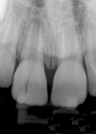 Hình 2. Chấn thương vật lý do chơi thể thao có thể gây nên nứt dọc chân răng. Đường nứt ở hình trên ở răng một trẻ 7 tuổi bị chấn thương do động kinh.