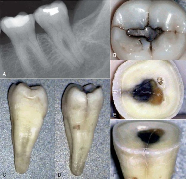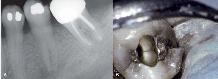 Hình 4. Thường khó chẩn đoán nứt dọc chân răng trừ khi là phải tháo bỏ miếng trám cũ