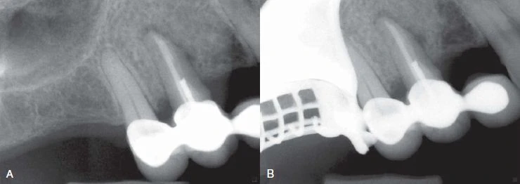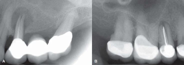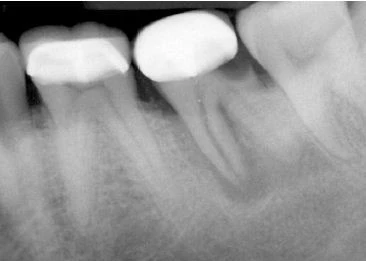 Hình 15. Khi răng có ống tuỷ rộng hơn so với răng cùng loại hoặc so với răng cạnh nó thì nên nghi ngờ có nứt dọc chân răng