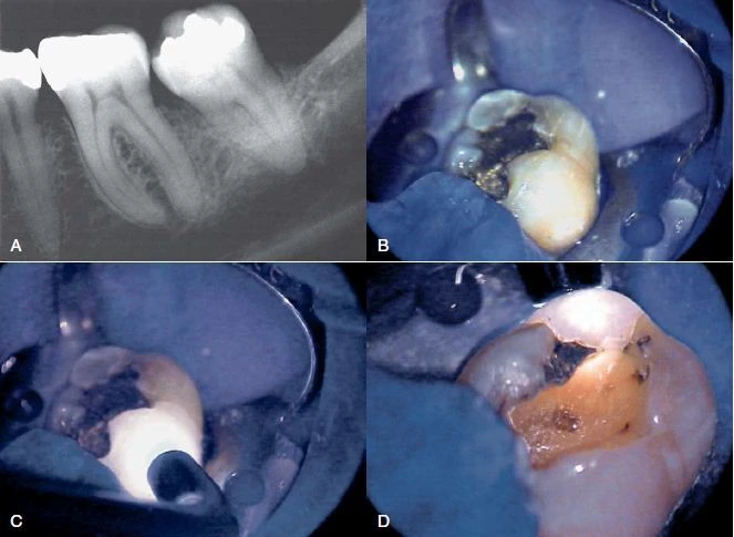 Hình 9. Đôi khi không có dấu hiệu rõ ràng cho thấy lý do răng có triệu chứng. (A) Hình ảnh X quang cho thấy răng cối lớn thứ hai hàm dưới có miếng trám sâu mức độ trung bình. (B) Thử tuỷ cho thấy răng chết tuỷ. Không chiếu sáng nên không thấy có đường nứt nào cả. (C) Chiếu ánh sáng có cường độ cao lên bề mặt răng, quan sát thấy vết nứt ở mặt ngoài. (D) Chiếu sáng vào mặt xa – trong của răng.