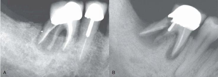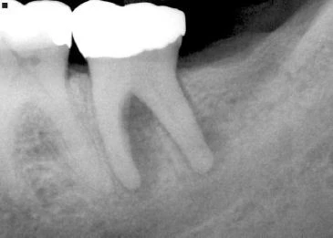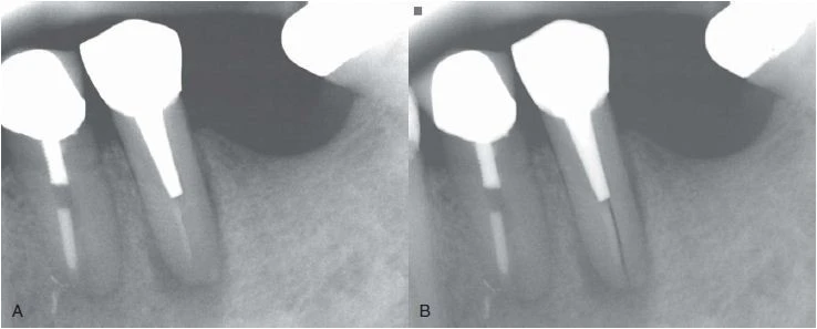 Hình 11. Mặc dù nứt dọc chân răng không phải lúc nào cũng thấy được trên X quang nhưng với một góc chụp đúng thì có thể quan sát rõ đường nứt.