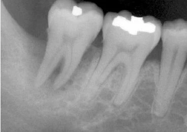 Hình 14. Tiêu xương rộng khu trú quanh một răng, những răng cạnh đó bình thường, gợi ý một trường hợp nứt dọc chân răng