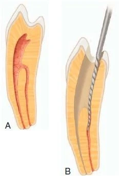 Hình 7 – 16. A, Nhìn từ phía gần răng cối nhỏ hàm dưới cho hình ảnh ống tủy loại V theo Vertucci. Ống tủy phía trong chia ra từ ống tủy chính tạo thành một góc vuông. B, Hình ảnh giải phẫu này đòi hỏi phải mở rộng xoang tủy về phía trong tạo một đường đi thẳng vào ống tủy trong. Việc này nên thực hiện dưới kính hiển vi nha khoa.