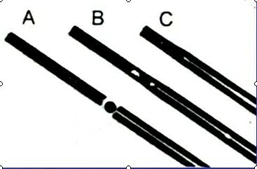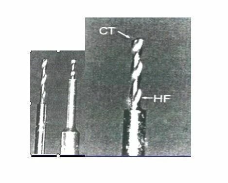 – Mũi khoan dùng cho chốt có ren xoắn trôn ốc dùng để lưu nhựa Composite và Amalgam thì đầu mũi khoan nhỏ hơn đường kính của chốt pin. Mũi khoan loại này có khấc chỉ để khoan được chiều sâu 2mm thôi (hình số 14).
