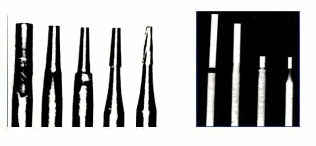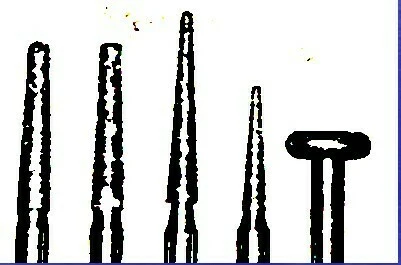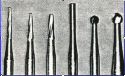 – Mũi khoan thép, có loại hình nón trụ dài và ngắn, có loại mũi khoan tròn số 4. Để loại bỏ mùn ngà ở phía sâu, có loại mũi khoan tròn số 6 dùng cho tay khoan tốc độ chậm.